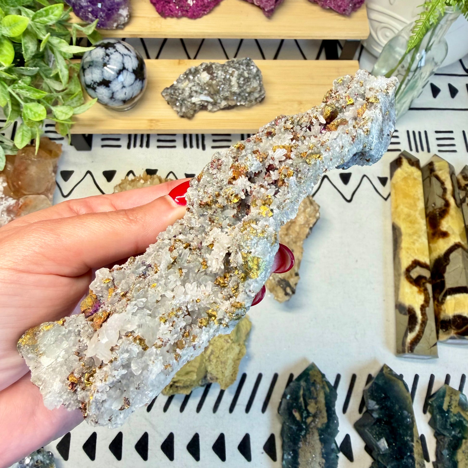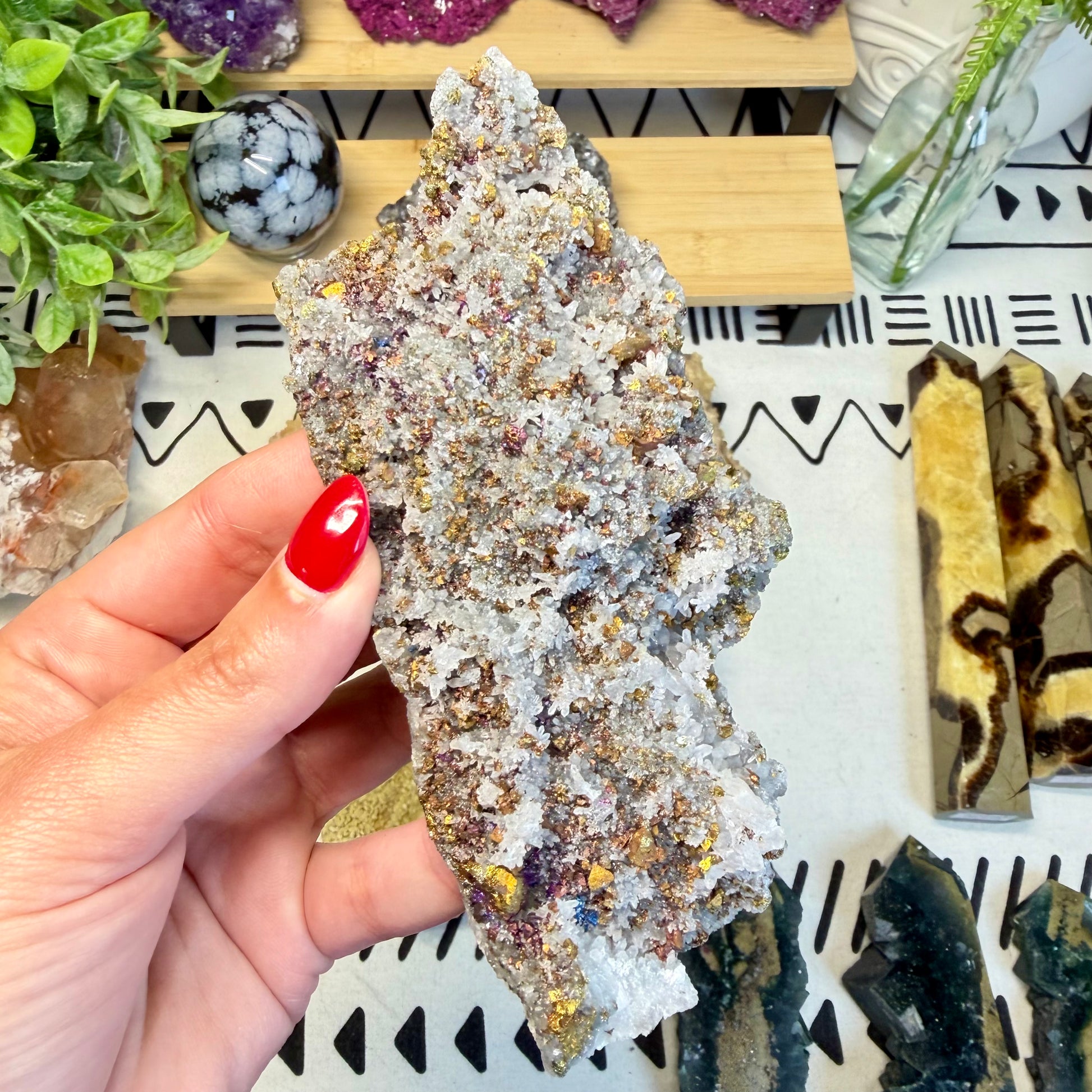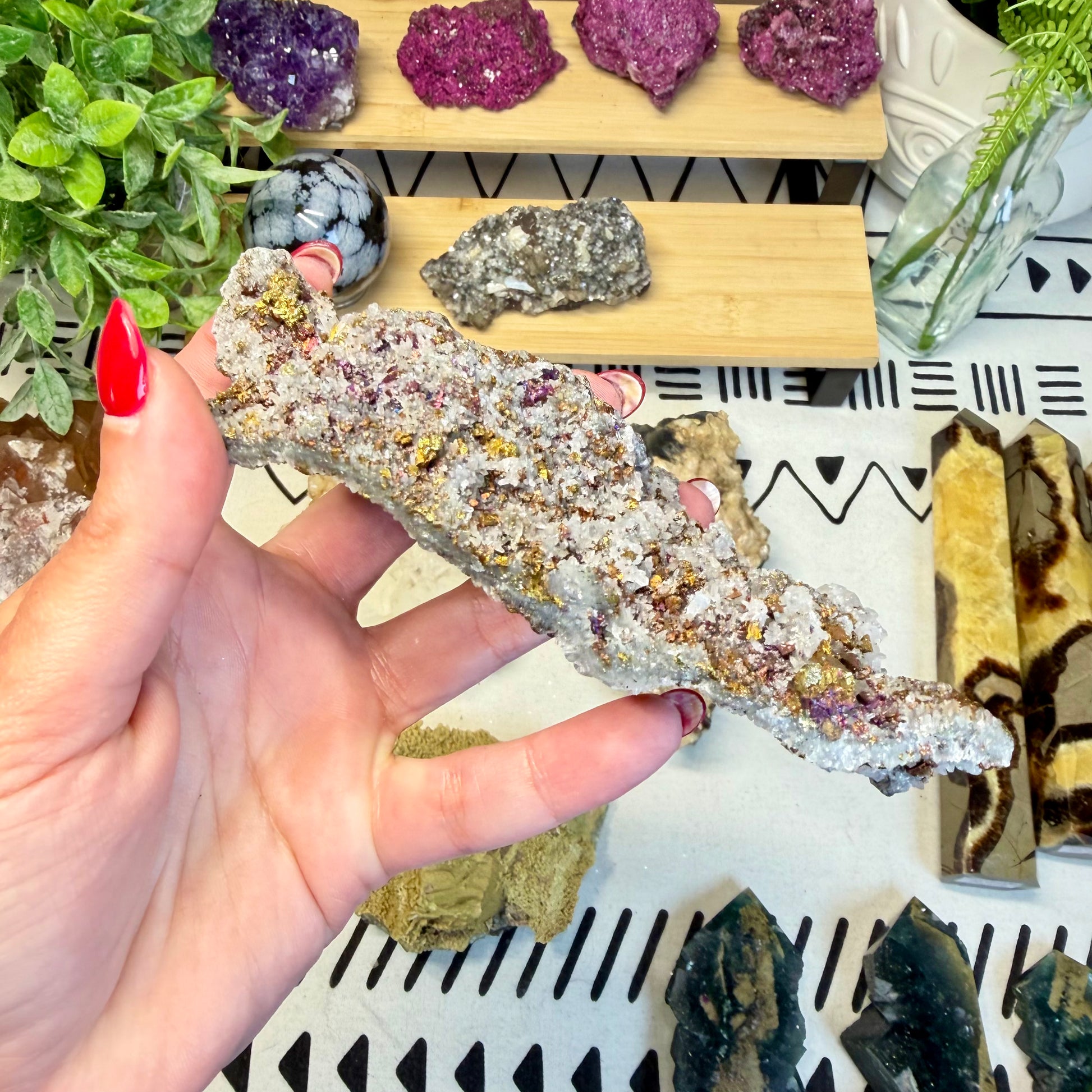 Bornite is associated with the solar plexus and crown chakras, encouraging confidence, vitality, and spiritual awareness. It is often used to inspire optimism, stimulate creativity, and promote a sense of empowerment and renewed purpose.
