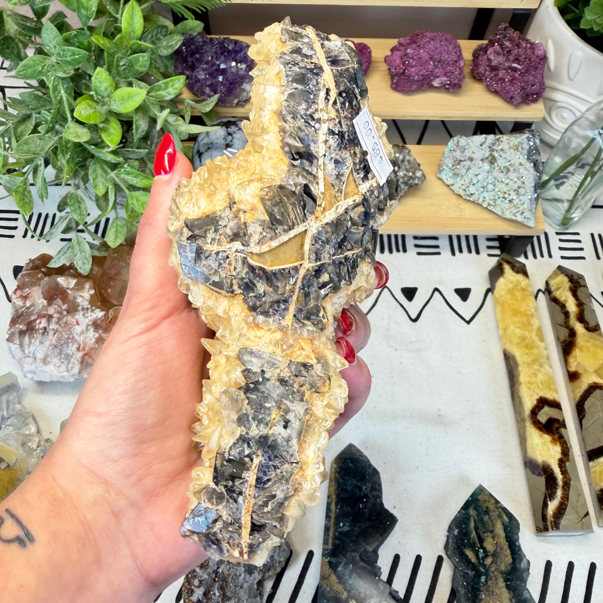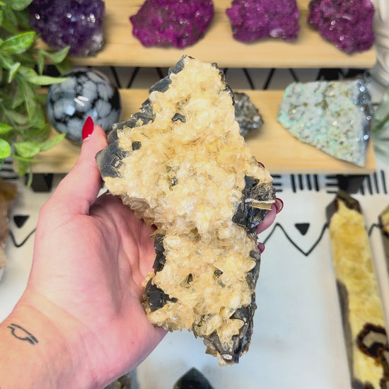 Beautiful and harmonizing, Fluorite with Calcite combines the mental clarity of Fluorite with the gentle amplifying and soothing energy of Calcite. This natural pairing promotes focus, emotional balance, and a steady flow of positive energy.